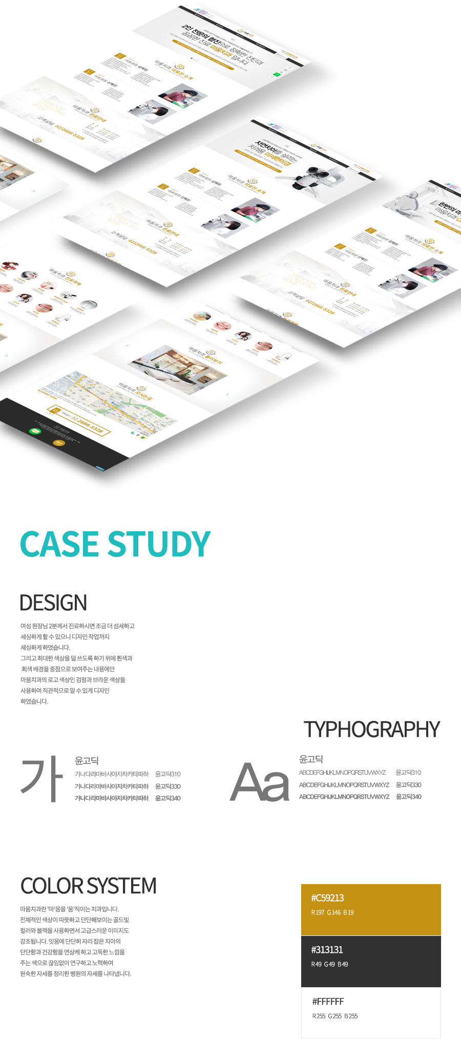 그리고 최대한 색상을 덜 쓰도록 하기 위에 흰색과 회색 배경을 중점으로 보여주는 내용에만 마움치과의 로고 색상인
