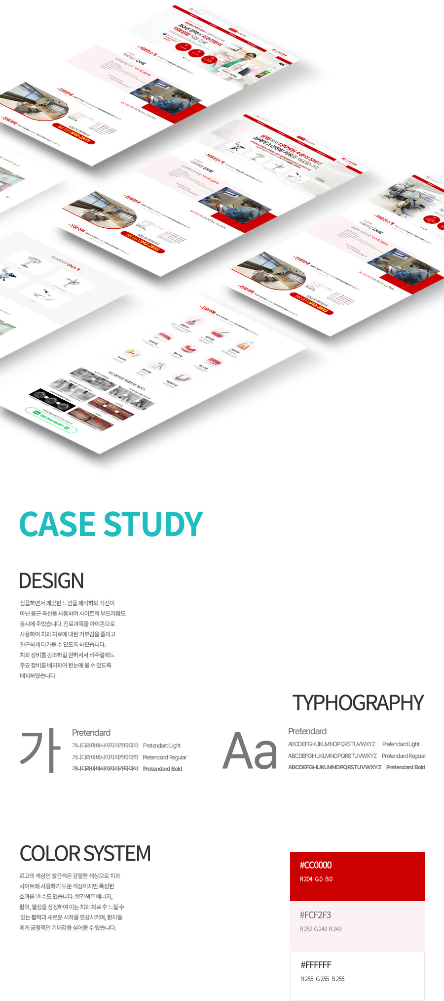 로고의 색상인 빨간색은 강렬한 색상으로 치과 사이트에 사용하기 드문 색상이지만 특정한 효과를 낼 수도 있습니다.