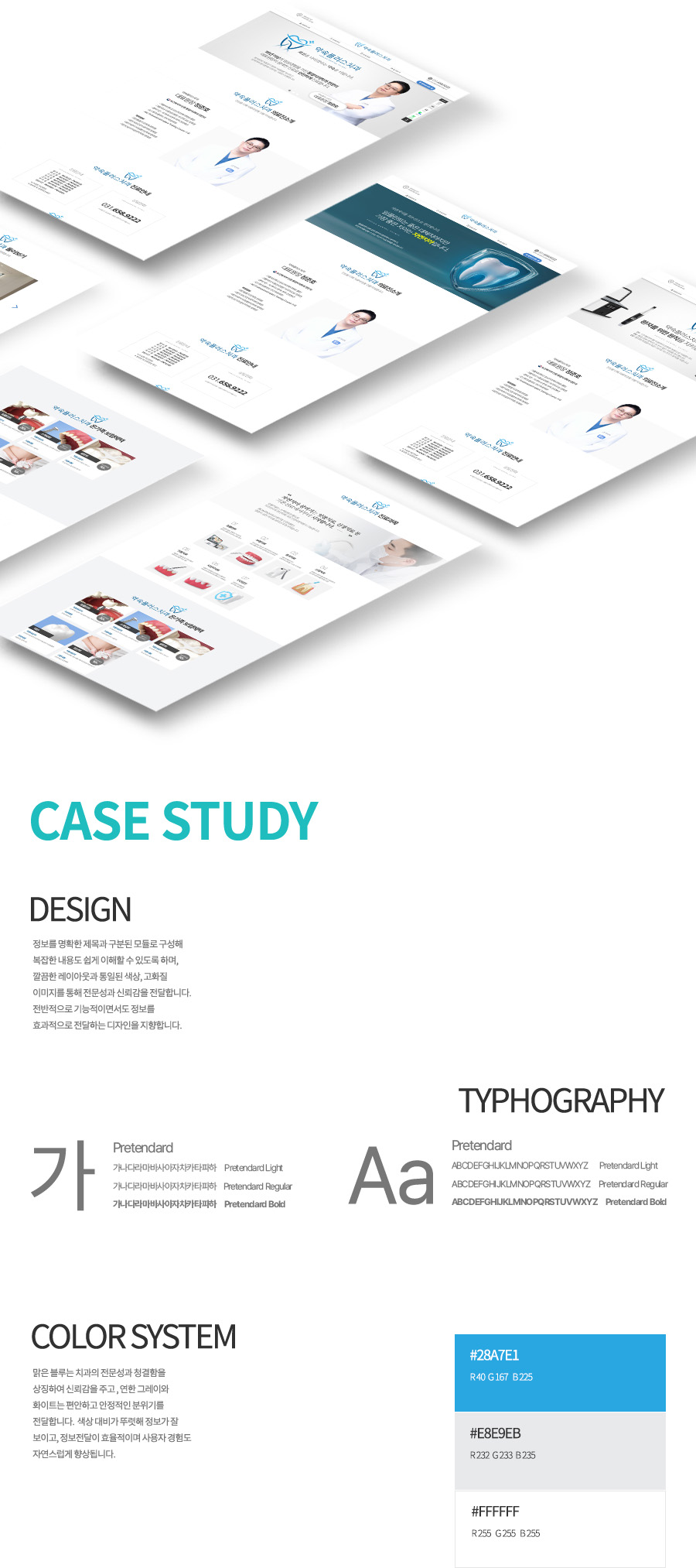 맑은 블루는 치과의 전문성과 청결함을 상징하여 신뢰감을 주고 , 연한 그레이와 화이트는