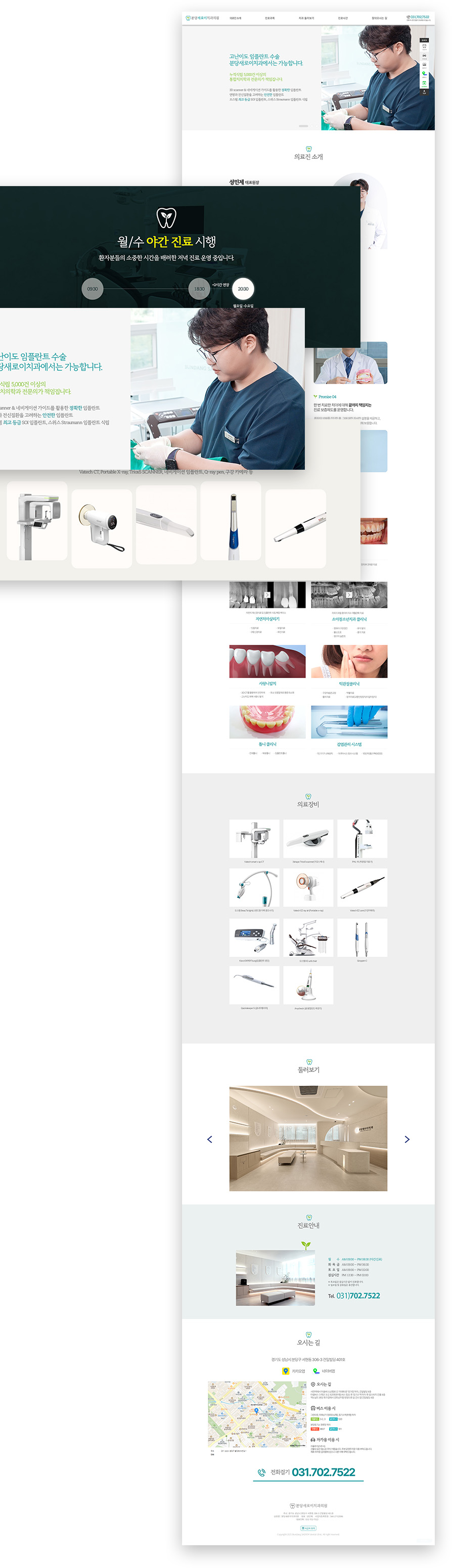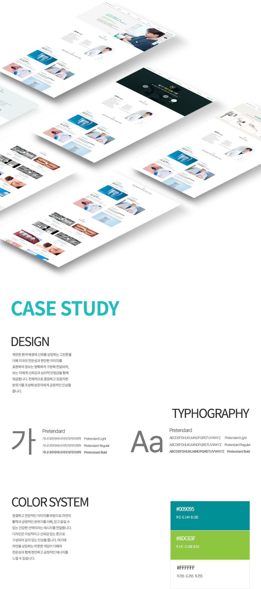 깨끗한 흰색 배경에 신뢰를 상징하는 그린톤을 더해 치과의 전문성과 편안한 이미지를 표현하여