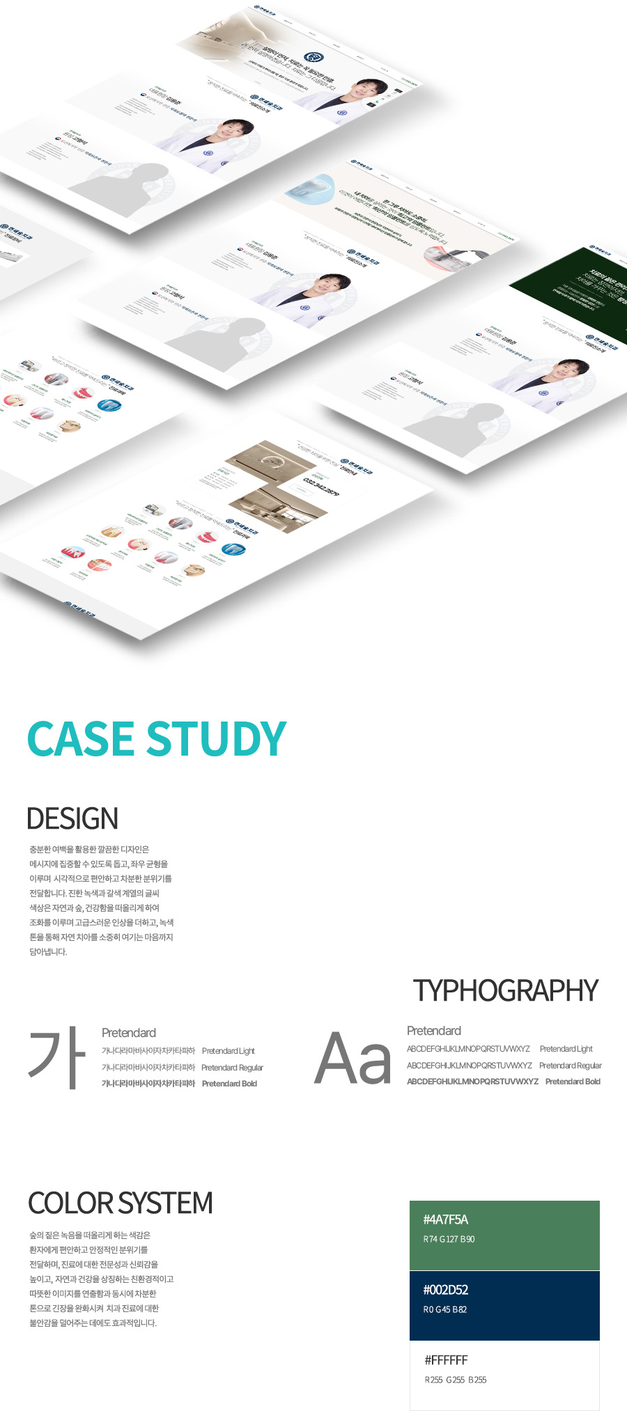 숲의 짙은 녹음을 떠올리게 하는 색감은 환자에게 편안하고 안정적인 분위기를 전달하며, 진료에 대한 전문성과 신뢰감을 높이고,