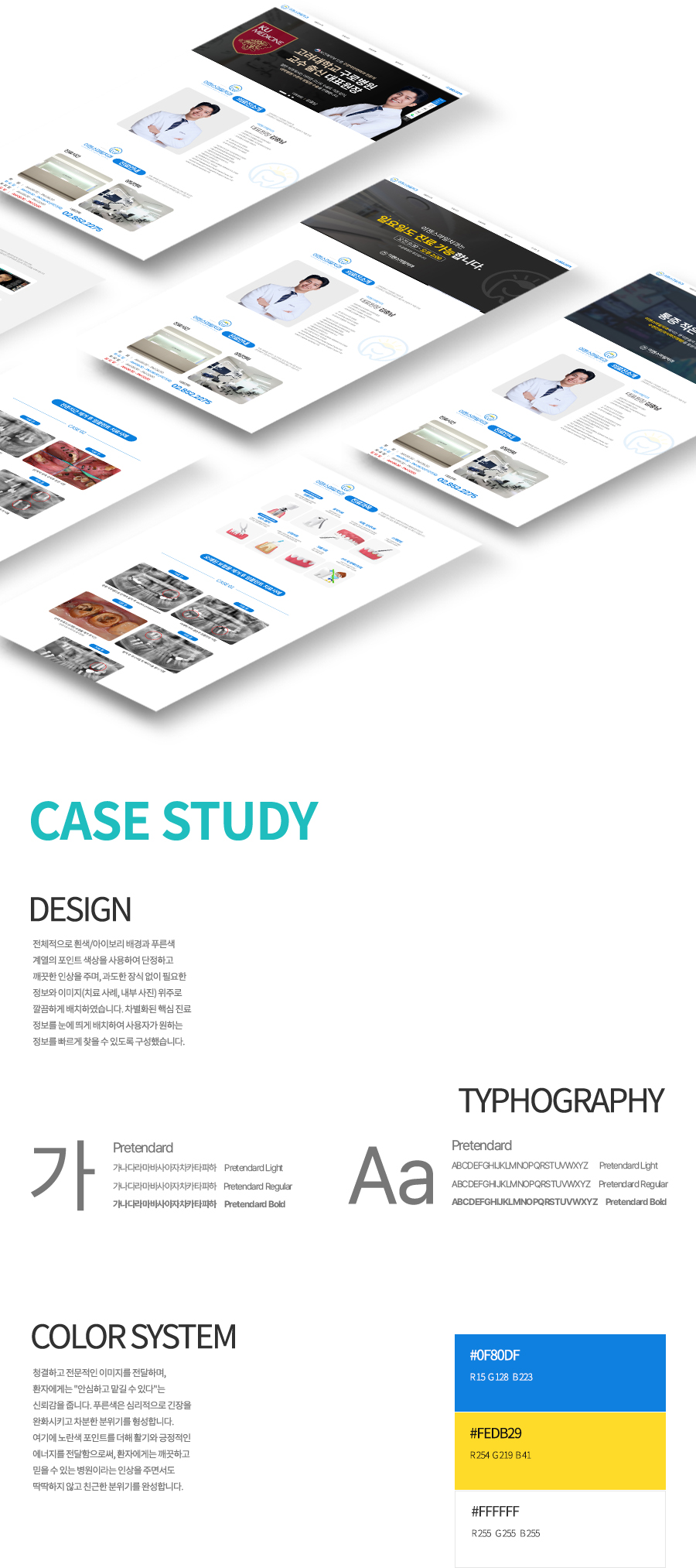 과도한 장식 없이 필요한 정보와 이미지(치료 사례, 내부 사진) 위주로 깔끔하게 배치하였습니다.