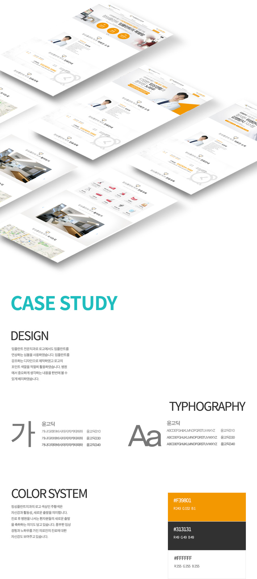 임플란트를 강조하는 디자인으로 제작하였고 로고의 포인트 색깔을 적절히 활용하였습니다.
