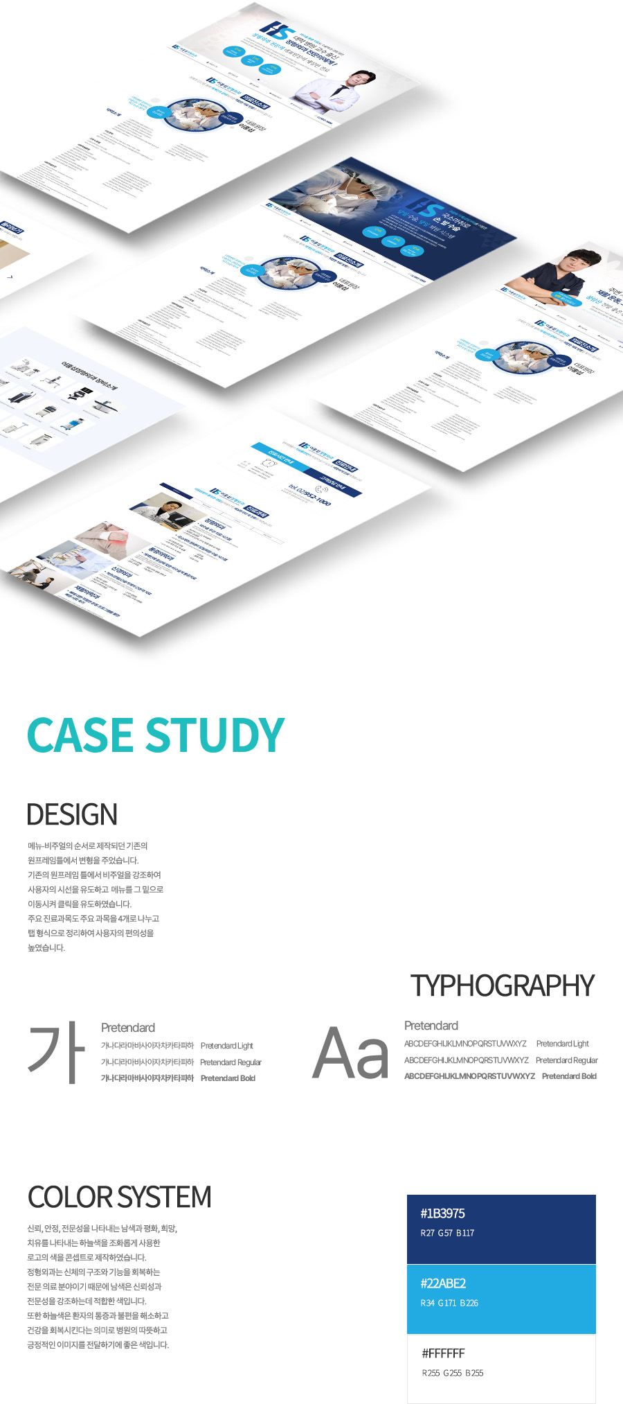 강조하는데 적합한 색입니다. 또한 하늘색은 환자의 통증과 불편을 해소하고 건강을 회복시킨다는 의미로 병원의 따뜻하고 긍정적인 이미지를 전달하기에 좋은 색입니다.
