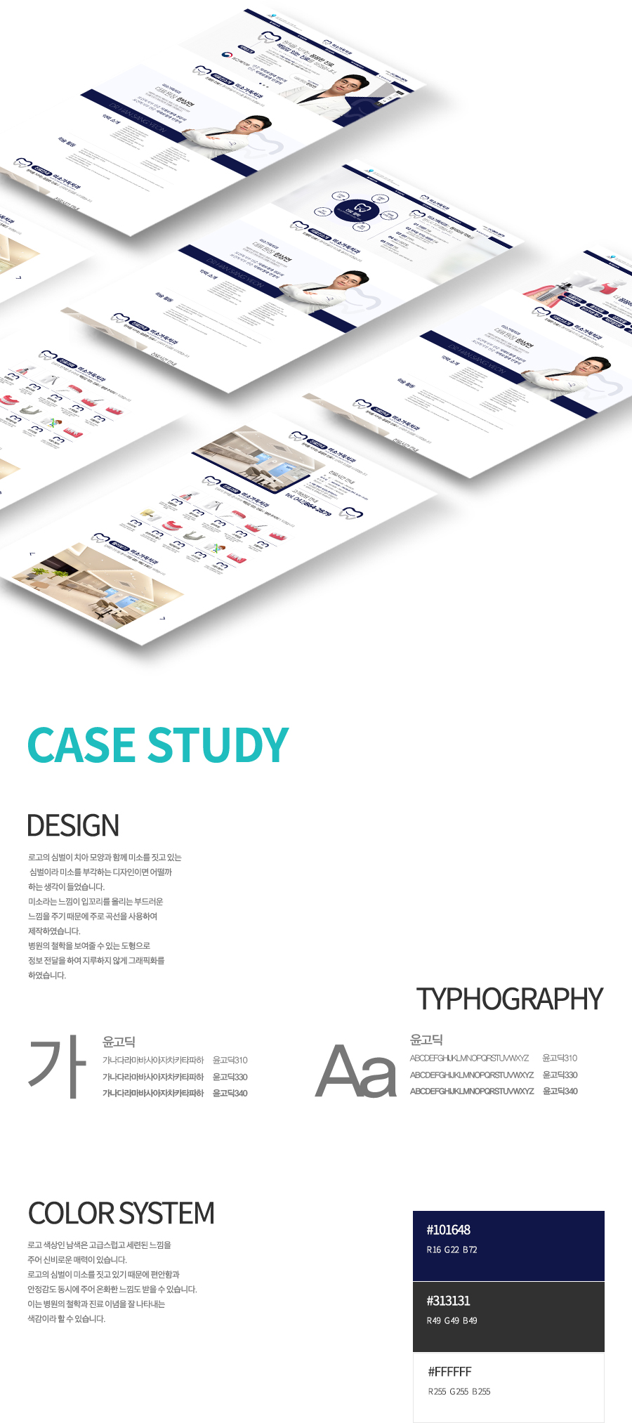 로고의 심벌이 치아 모양과 함께 미소를 짓고 있는 심벌이라 미소를 부각하는 디자인이면 어떨까 하는 생각이 들었습니다.