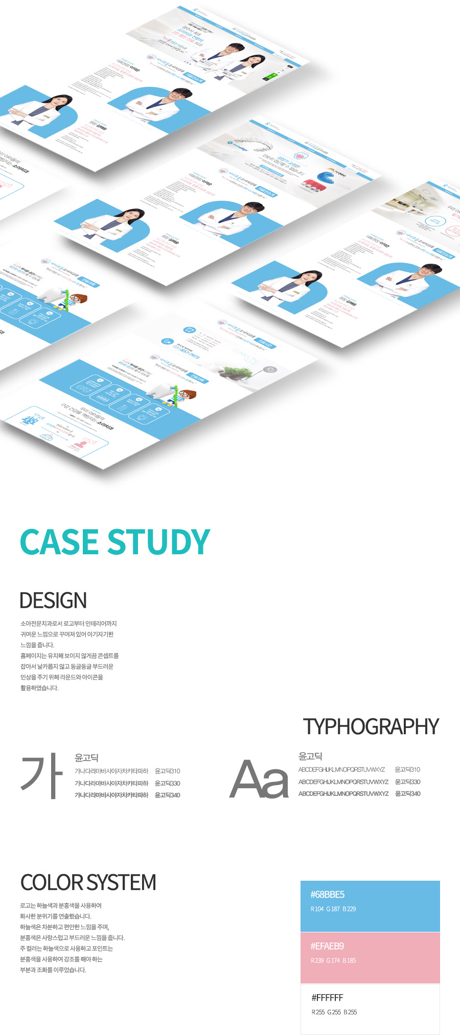 주 컬러는 하늘색으로 사용하고 포인트는 분홍색을 사용하여 강조를 해야 하는 부분과 조화를 이루었습니다.