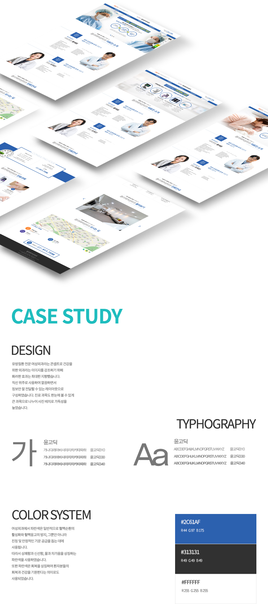 정보만 잘 전달할 수 있는 레이아웃으로 구성하였습니다. 진료 과목도 한눈에 볼 수 있게 큰 과목으로 나누어 사진 배치로 가독성을 높였습니다.