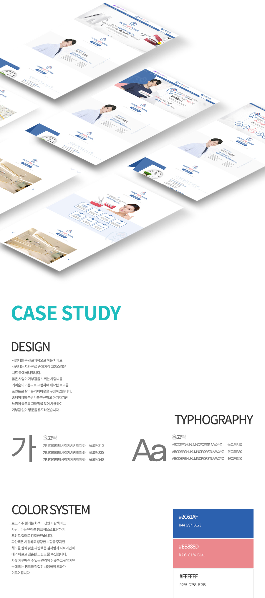 많은 사람이 거부감을 느끼는 사랑니를 귀여운 아이콘으로 표현하여 제작한 로고를 포인트로 살리는 레이아웃을 구성하였습니다.